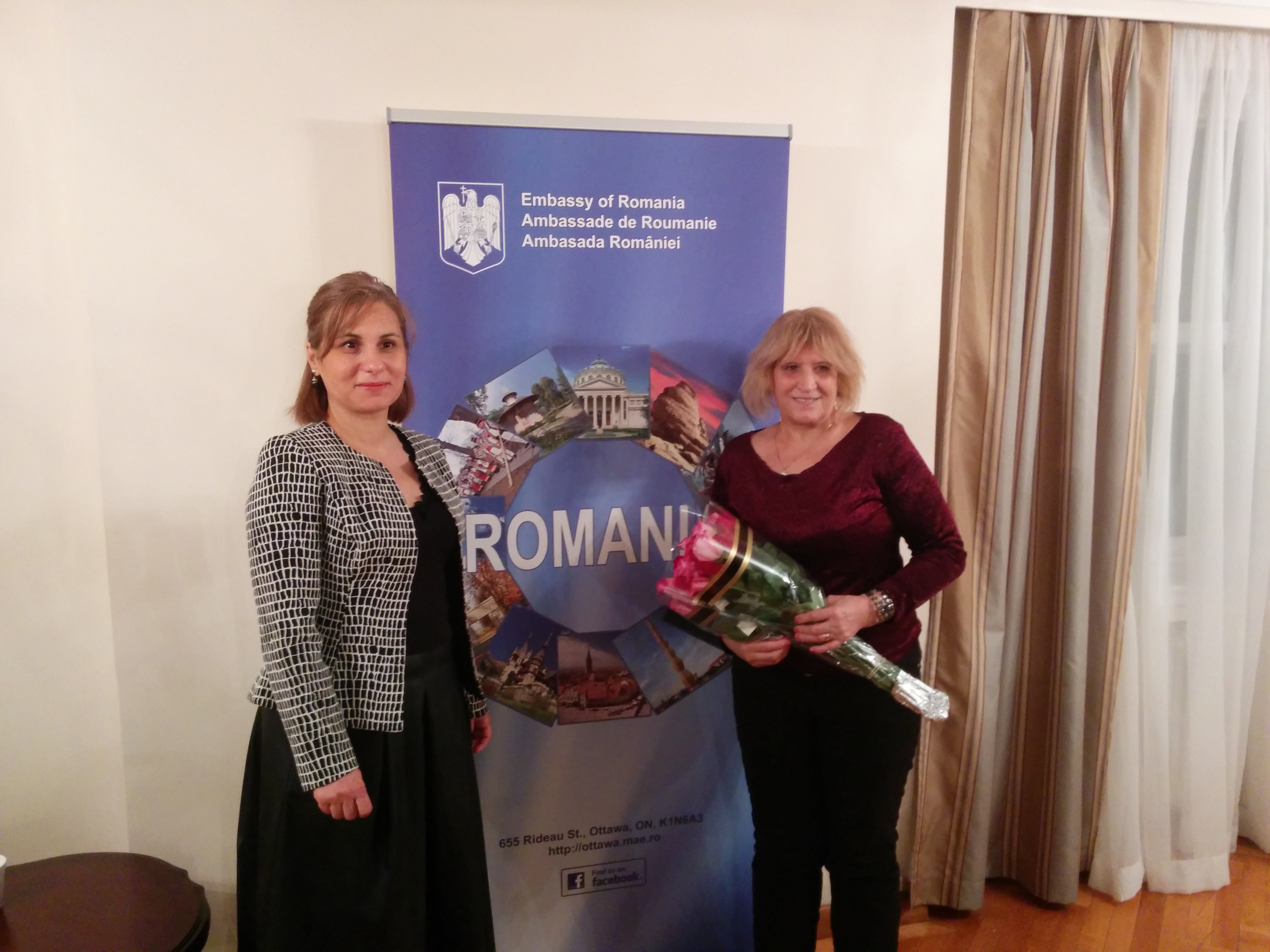 Joi, 8 ianuarie 2015, Ambasada Romaniei a gazduit o intilnire a scriitoarei Veronica Balaj cu romanii din Ottawa. Seara literara a fost organizata de Asociatia Romano-Canadiana din Ottawa-Gatineau. Din partea ARCOG, Cristina Mihai si Madalina Voina au prezentat-o pe Veronica Balaj publicului. In continuare, scriitoarea a vorbit despre opera sa, a citit citeva poezii si a raspuns la intrebarile celor prezenti. La sfirsitul intilnirii, Veronica Balaj a oferit carti cu autograf participantilor. ARCOG multumeste Amabasadei Romaniei pentru sprijinul acordat. Veronica Balaj este membra a Uniunii Scriitorilor din Romania si membra asociata a Asociatiei Canadiene a Scriitorilor Romani. Detine mai multe premii literare, dintre care mentionam Premiul de Excelenta al Uniunii Scriitorilor din Romania pentru romanul Baltazara. Poeta, prozatoare si jurnalista, Veronica Balaj are o opera bogata, ce include cartile Parisul fara mine (1991), Sarbatori amanate (1992), Cu îngerul la arat (1997), Cafeneaua anticarului (1999), Intre alb si noapte (2000), Baltazara (2001), Carnavalul damelor (2005), Scut iluzoriu (2010), Ierusalim-Jerusalem (2013), Cina lupilor (2013) si Orasul alb (2014).